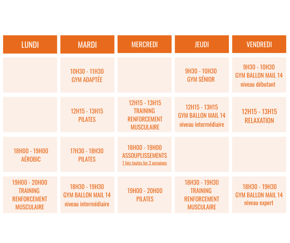 Nous proposons un large choix d’activités : Pilates, renforcement musculaire, aérobik, gym ballon, assouplissement, gym adaptée et gym senior…